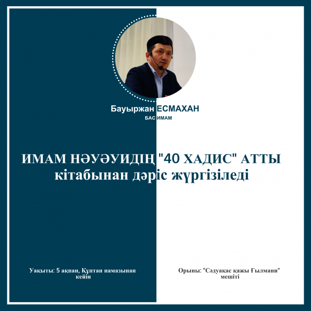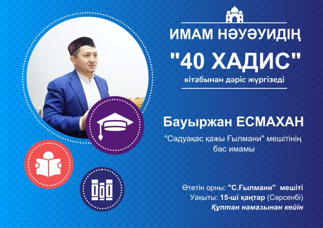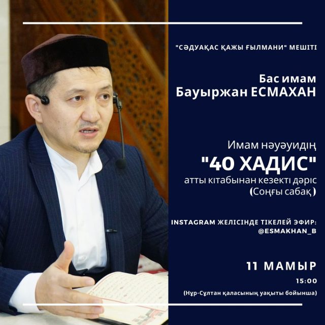 13 мамыр. Нұр-Сұлтан. Sunna.kz – Бас имам Бауыржан Есмахан жүргізген имам Нәуәуидің «40 хадис» еңбегі бойынша жүргізілген сабақ мәреге жетті, деп хабарлайды sunna.kz тілшісі.