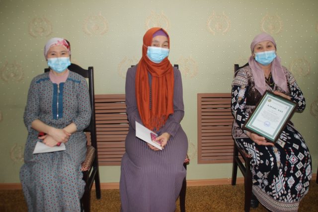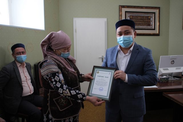 Ұзақ жылдар мешітіміздің шаруашылық қызметкері ретінде тынбай жұмыс жасап, құлшылық ордасының таза да, ретті болуына тер төккен Тұрбашова Ұмсын апайға арнайы бас имамның «Алғыс хаты» табысталды.