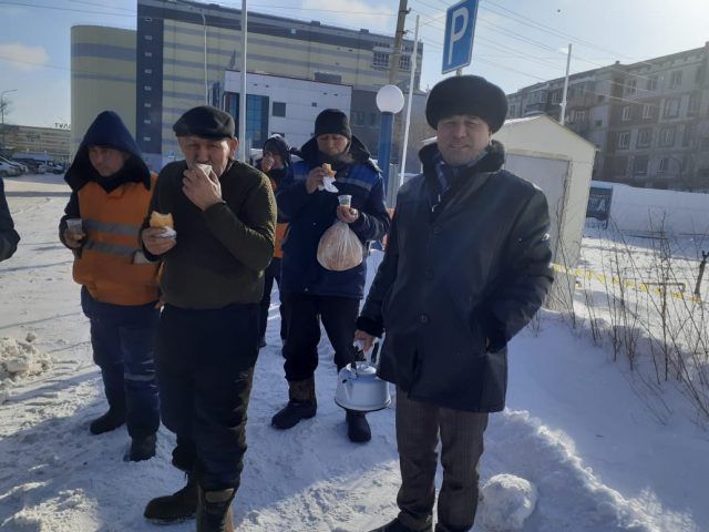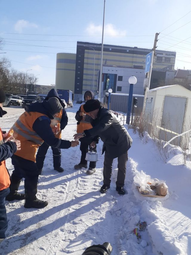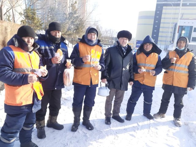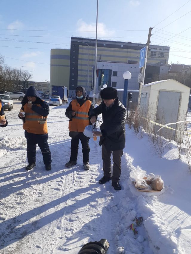 Қасиетті жұма күні қайырымдылық акциясы аясында елорданың көше тазалаушы қызметкерлеріне ыстық тамақ пен шай жеткізіліп, еңқор жандардың жұмысына қолдау көрсетілді.