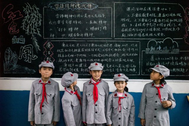 Қытайдың Гуйчжоу провинциясындағы Қызыл армия атындағы Ян Дэчжи бастауыш мектебінің оқушылары пионер галстугін тағып, жұлдызды фуражка киеді.