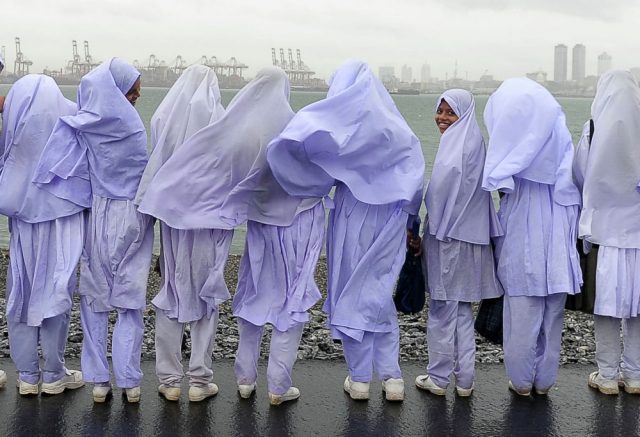 Коломбо теңіз портының жағалауында тұрған Шри-Ланкадағы мұсылман оқушы қыздар