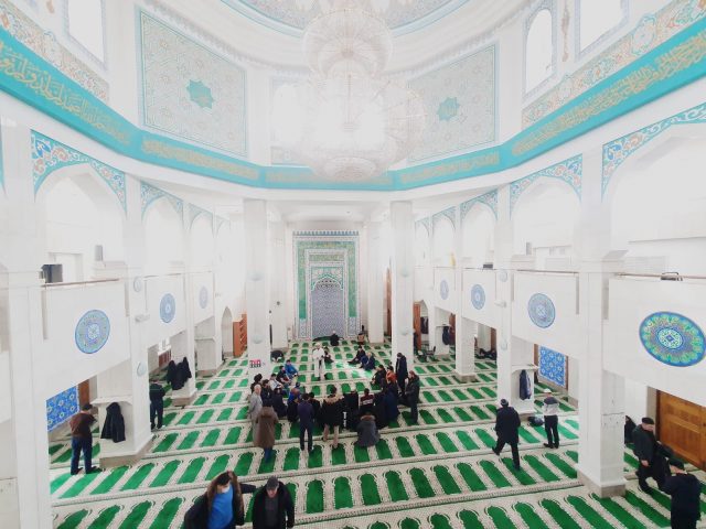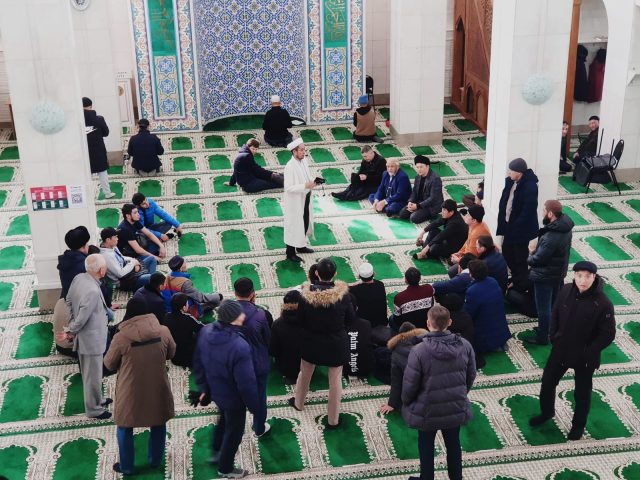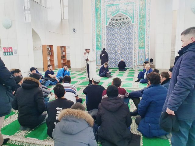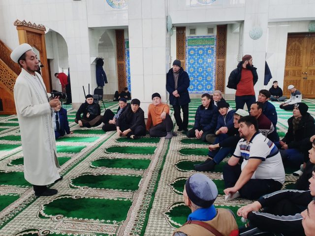Кезекті «Намаз оқып үйренейік» деп аталатын практикалық дәріс аясында жиналған жамағатқа дәстүрлі Ислам қағидаттары негізіндегі намаз мәселелері сөз болды. Мешіт қызметкері Ханафи мәзһабы бойынша намаз оқу үлкісін көрсетіп, практикалық дәріс жүргізеді.