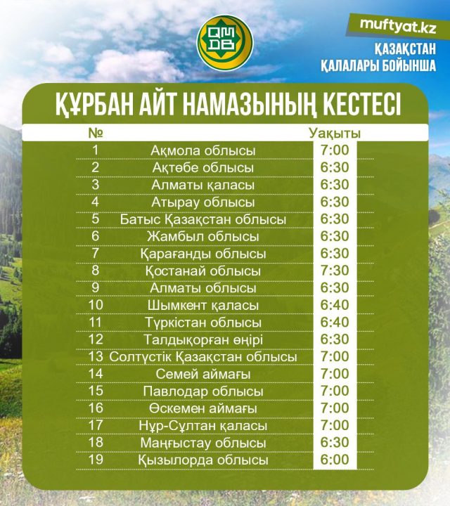 9 шілде – Құрбан айт мейрамының алғашқы күні. Осы күні оқылатын Құрбан айт намазының еліміз бойынша әзірленген кестесін назарларыңызға ұсынамыз. Айт құтты болсын, ағайын!
