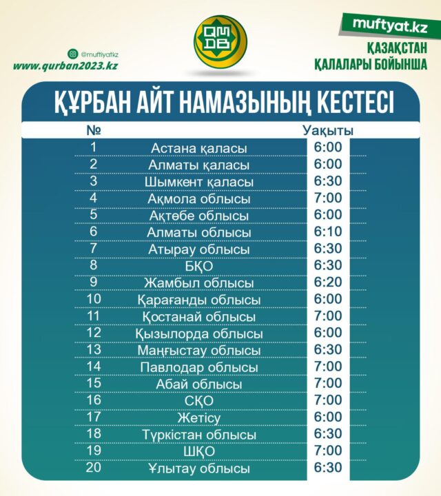 ҚМДБ: Еліміз бойынша айт намазының кестесі ЖаңалықтарБасты тақырыпҚМДБ Уақыты Маусым 26, 2023 0 779 Бөлісу 0 779 Бөлісу