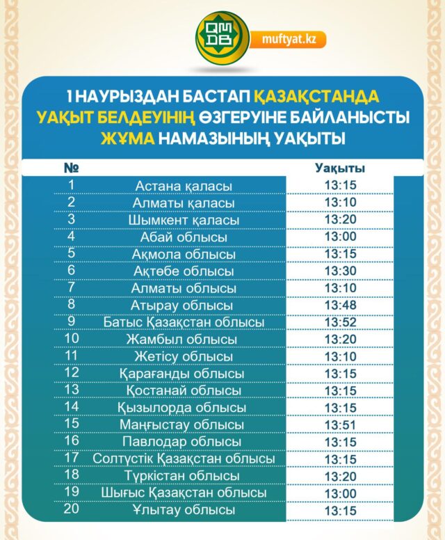 Алла қаласа 29 ақпаннан 1 наурызға қараған түні сағат 00:00-де Қазақстан бойынша UTC (Дүниежүзілік үйлестірілген уақыт) +5 уақытына ауысқан сәтте намаз уақыттары да автоматты түрде өзгереді. Қазақстан мұсылмандары діни басқармасының ресми www.muftyat.kz сайтындағы намаз кестесінен өздеріңізге қажетті ауыл мен қаладағы намаз уақыттары жайлы мәліметтерді алуға болады. Ал жұма намазына қатысты мәлімет төмендегі кестеде көрсетілді.