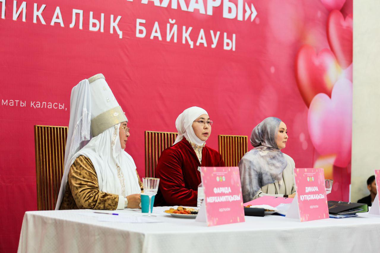 Мұсылман қазақ әйелдерінің заманауи сән сайысында әділқазылар алқасының құрамын ҚМДБ Әйел-қыздар секторының меңгеруші Динара Құтқожа, ҚР еңбек сіңірген қайраткері, стилист моделер Фарида Мерхамитқызы, Дизайнер-стилист Жұлдыз Шарипова төрелік етуде.