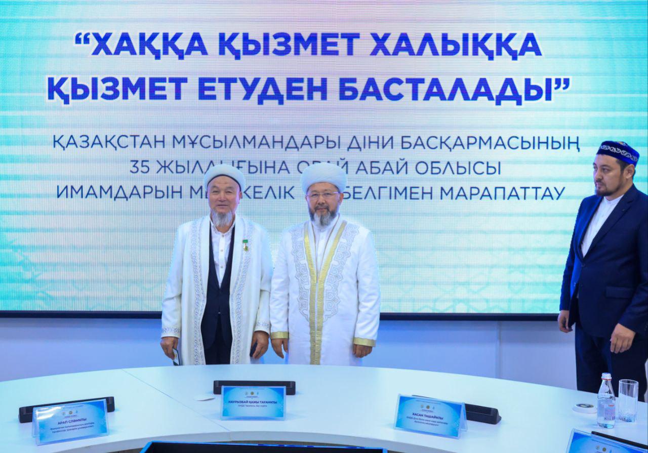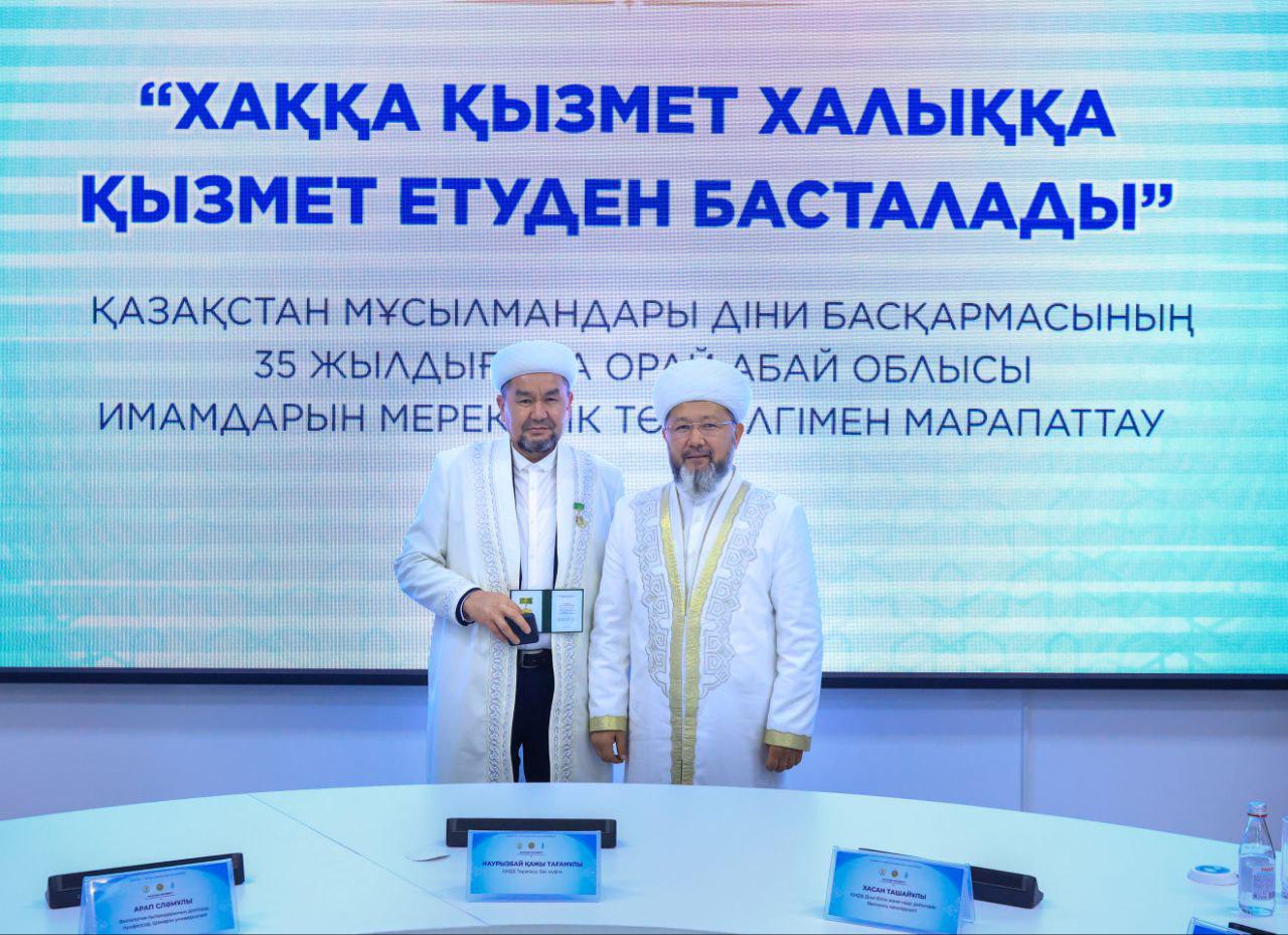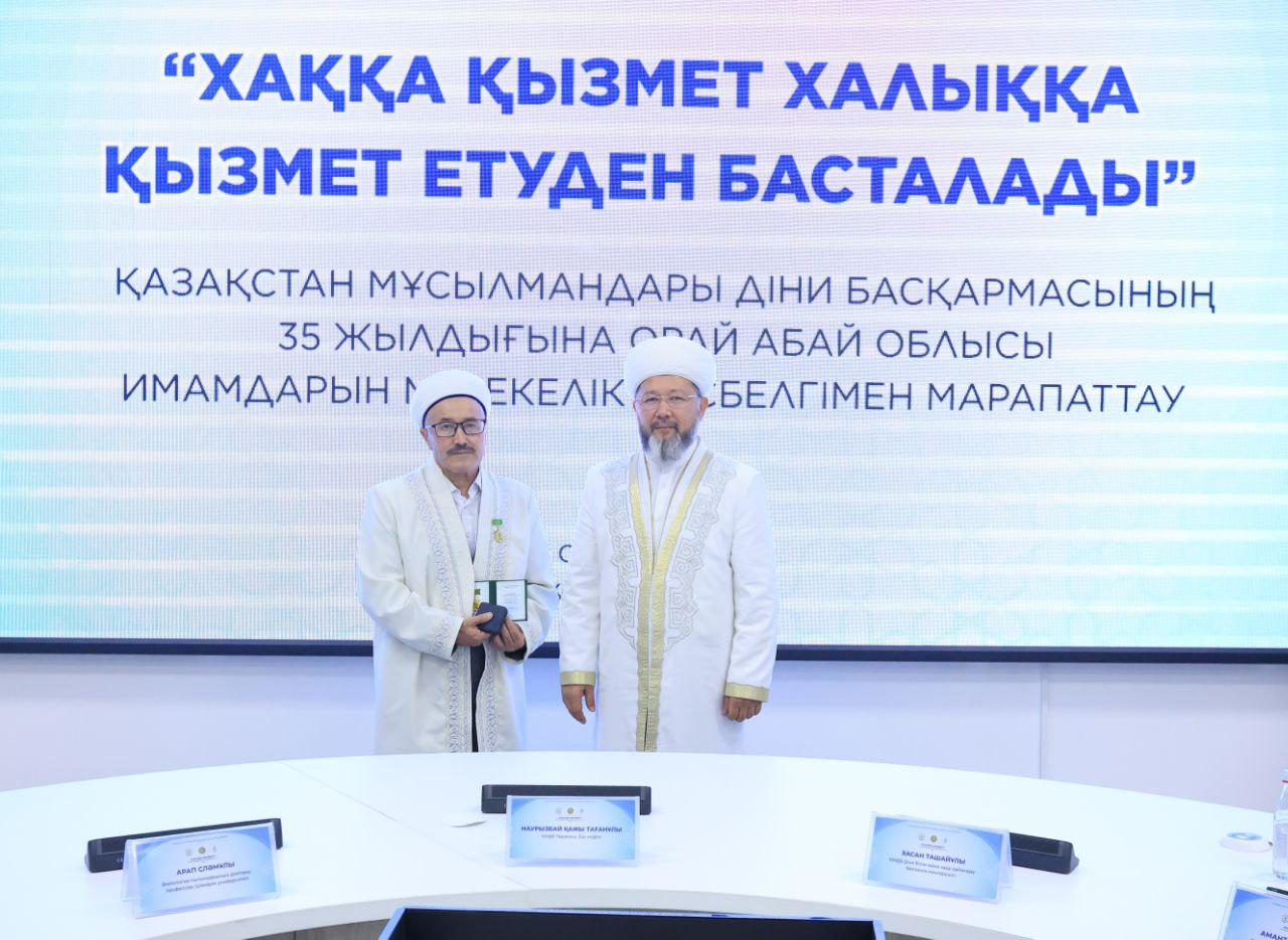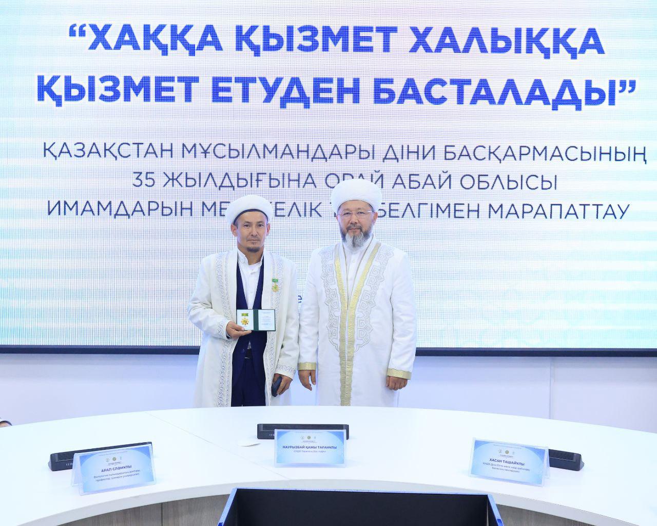 Абай облысына жұмыс сапары барысында Қазақстан мұсылмандары діни басқармасының төрағасы, Бас мүфти Наурызбай қажы Тағанұлы өңірдің бірқатар дін қызметкерлерін ҚМДБ-ның 35 жылдық мерейтойлық медалімен марапаттады.